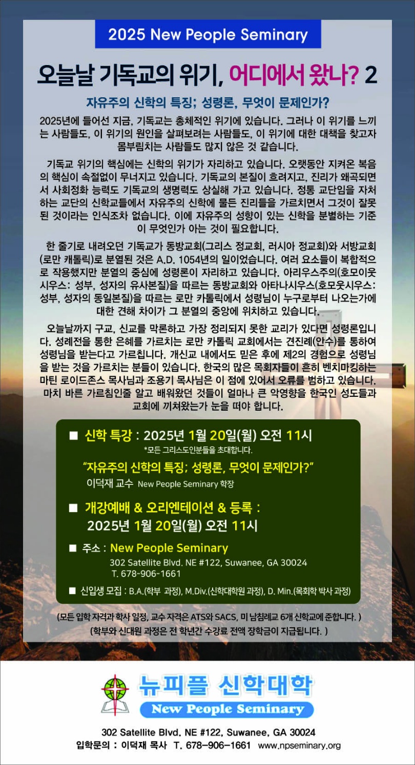 2025년 봄 학기, 개강예배와 특강, 오리엔테이션과 등록안내 페이지 정보 작성자 뉴피플신학대학 댓글 0건 조회 1,945회 작성일 25-01-08 10:45 List 본문 2025년 봄 학기 특강과 개강얘배, 오리엔테이션과 등록이 2025년 1월 20일 오전 11시에 있습니다. 주위에 있는 분들에게 알려서 함께 특강에 참여하시고, 새로운 신입생 모집에 힘써 주시면 감사하겠습니다. 다음글여름학기 시작 24.05.04